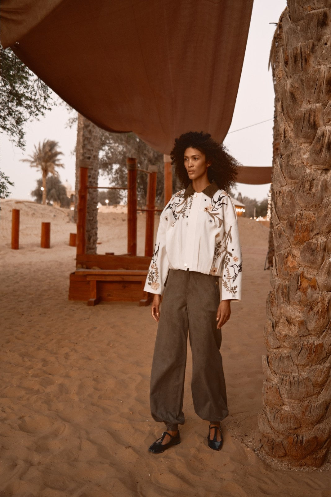 The collar is made from green corduroy fabric, and the piece is adorned with laser-cut floral and bird appliqués. Each embellishment is complemented with hand-sewn bead and stone detailing, adding a refined and artistic touch.