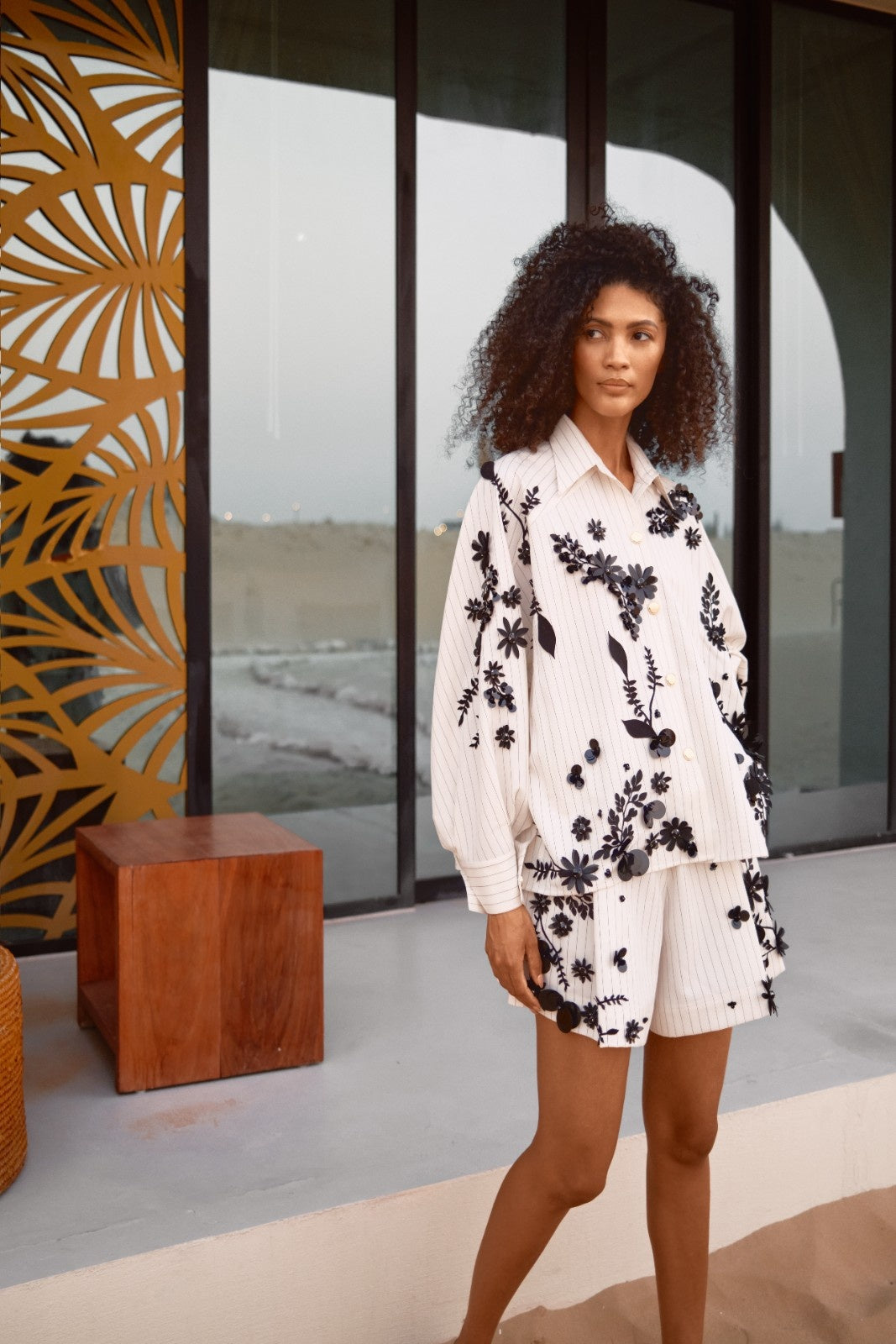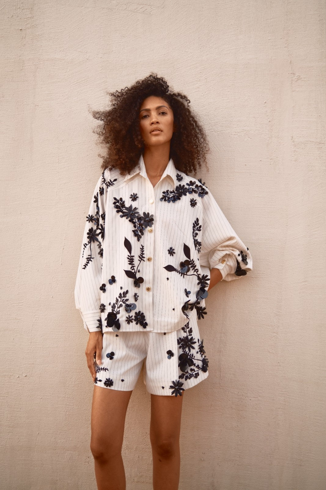 The Blouse is designed with sleeves that include double cuffs, each measuring 7 cm in length. The piece is beautifully adorned with black laser-cut flowers and leaves, while selected floral elements are embellished with sequins and hand-stitched stones for added shine and dimension.